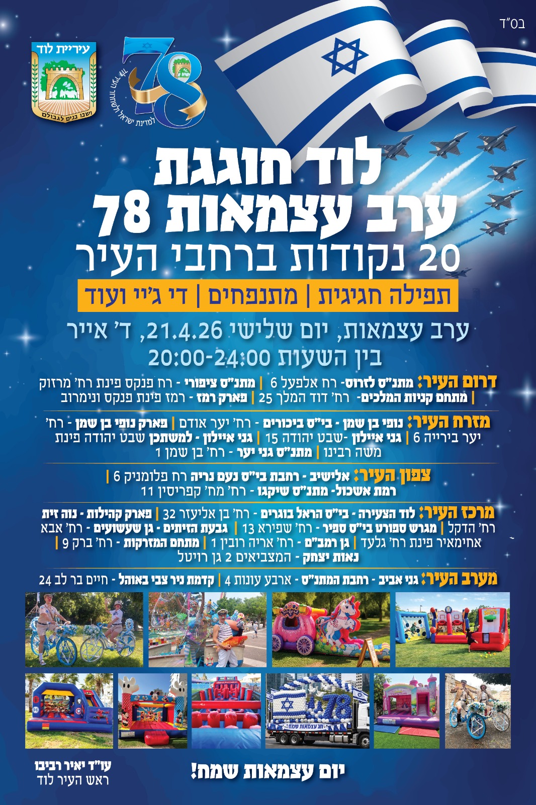 אמנם במה מרכזית עם אומנים עברה ליום ירושלים, אבל הכנו לכם 20 מוקדים בכל רחבי העיר עם אווירה של חג, תפילה, מוסיקה, מתנפחים (ברוב המוקדים).