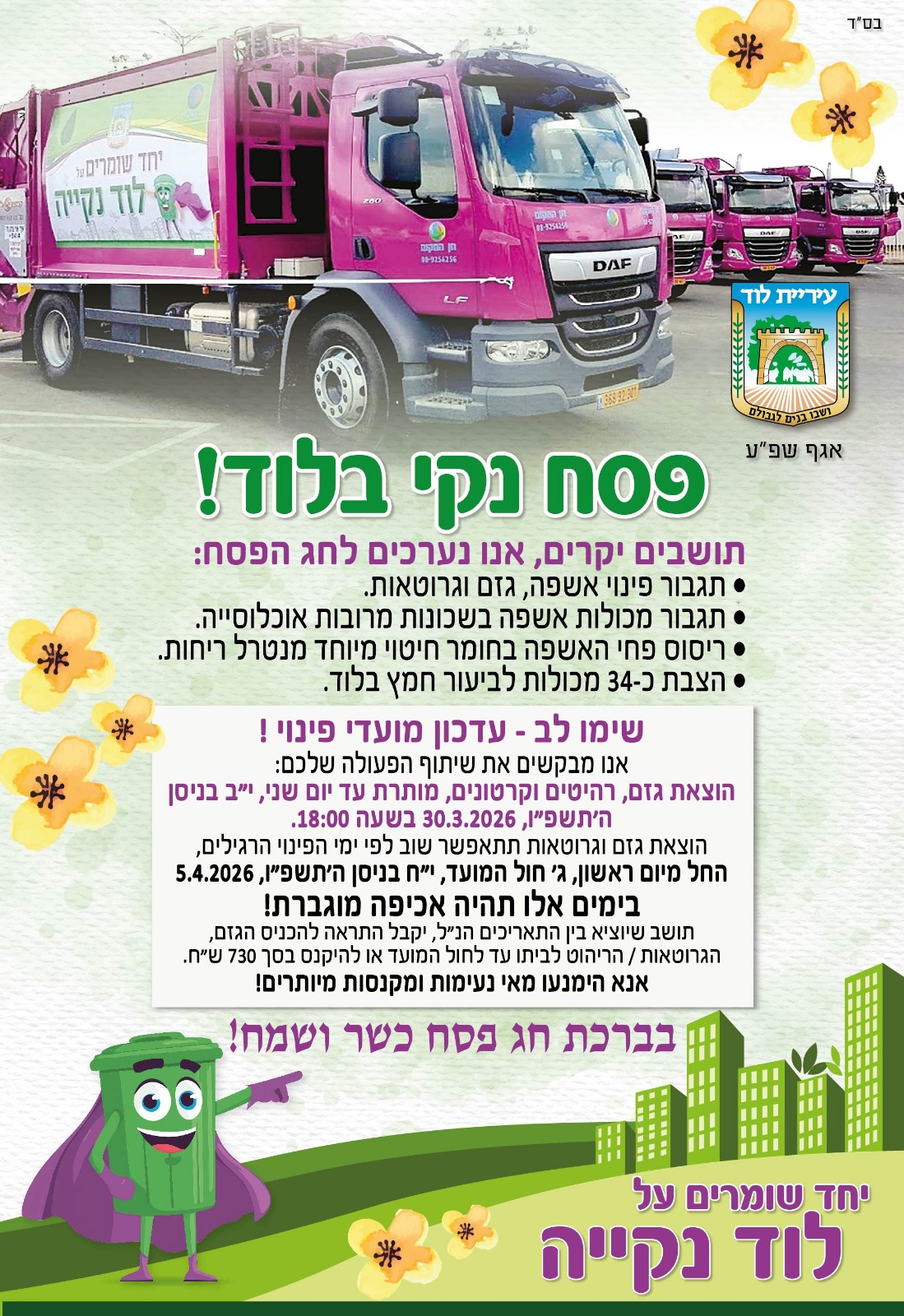 תושבים יקרים, ראו ההודעה החשובה בנושא פסח.